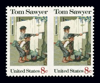 1027 nh 1470a image#1470a, 8c Tom Sawyer, horizontal pair, imperforate between, well centered, fresh, o.g., n.h., very fine; an extraordinarily rare error, with only seven pairs being known, one of which is damaged; 2001 PF certificate. (Image) $4,500.00