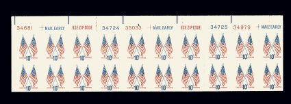 1029 nhPB 1509c, 1509d, 1509f image#1509c, 1509d, 1509f, 10c Flags, imperforate, imperforate vertically, and imperforate between, top margin plate number block of twenty, the right five pairs completely imperforate, the four pairs at left imperforate vertically and with blind horizontal perfs., the fifth pair from the left has blind perforations at top but is imperforate between and is the basis for the Scott listing of #1509f, o.g., n.h., gum bend at left affects about four stamps, staple holes in top selvage, very fine; to date this is the only example of the imperforate between error recorded, which is listed but not yet priced in Scott; 1991 PF certificate; the catalog value is for five imperforate pairs and four imperforate between pairs (with the unique #1509f error not priced). (Image) $8,500.00+