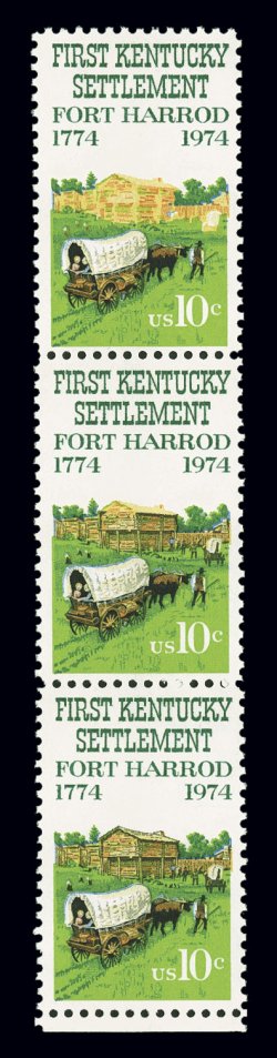 1030 nh 1542a image#1542a, 10c Kentucky Settlement, dull black omitted, vertical strip of three, the bottom stamp normal, the middle stamp with dull black partially omitted and the top stamp with dull black completely omitted, o.g., n.h., very fine; especially scarce in this transition form. (Image) $700.00+