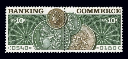 1033 nh 1578c image#1578c, 10c Banking and Commerce se-tenant pair, brown, blue and yellow omitted, exceptionally fresh, o.g., n.h., extremely fine; only one sheet containing sixteen pairs was ever discovered; photocopy of a 1991 PF certificate for the original discovery sheet before it was broken up. (Image) $2,750.00