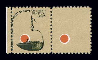 1022 O 1416c image#1416c, 6c Christmas toys, imperforate, used vertical se-tenant right-margin pair of #1416 and 1418, with plate no. 31907 in margin, Washington, D.C. machine cancel, light creasing which is immaterial considering this pair's unique status as a plate number pair, extremely fine; only one other pair has been recorded (a Mail Early slogan pair with the same postmark), in fact, this is the first time we have ever offered this error, as even the great William Floyd collection was missing this; 2001 PF certificate. (Image) $4,000.00