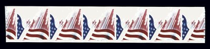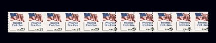 1061 nh 2605 var. image#2605 var., 23c Flag, Bureau pre-cancel coil, imperforate, five imperforate stamp contained in a strip of eleven, with the other six stamp misperforated, o.g., n.h., left two stamps with light horizontal crease, very fine; this is the only example we have seen of this error in any form, and could very well be a unique coil imperforate error; unlisted in Scott and Datz. (imagea) (Image) Est. 4,000-5,000