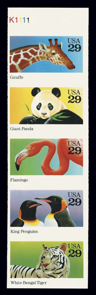 1062 nhBP 2709b image#2709b, 29c Wild Animals booklet pane of five, imperforate, o.g., n.h., fold between second and third stamp, and small gum disturbance at top, both of these exist in all known examples having been removed from booklets, very fine; only eight panes have been reported. (Image) $2,500.00