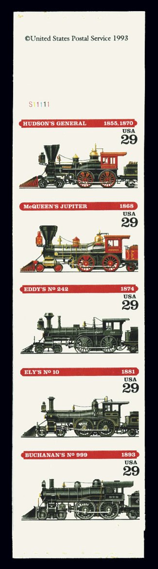 1064 nhBP 2847b image#2847b, 29c Locomotives, booklet pane of five, imperforate, single error pane still in the original booklet, o.g.,n.h., thin in top selvage and booklet fold between second and third stamps as always, very fine; a major modern booklet pane rarity, as only three panes are known to exist; 1997 PF certificate. (Image) Est. 3,000-4,000