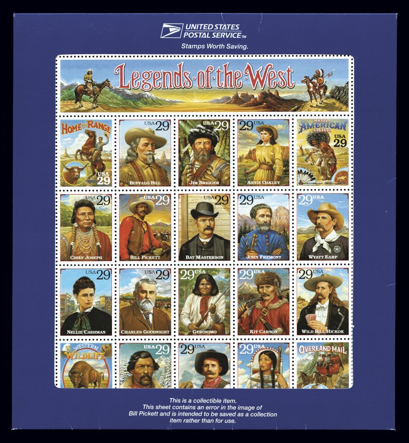 1065 nhbl 2870 image#2870, 29c Recalled Legends of the West, special se-tenant sheet of 20, in unopened post office envelope as issued to the drawing winners, o.g., n.h., extremely fine. (imagea) (Image) $220.00+