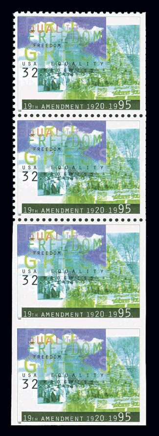 1066 nh 2908b image#2908b, 32c Woman Suffrage, imperforate, error pair in a transition strip of four, o.g., n.h., very fine; only twenty pairs have been reported. (Image) $1,500.00+