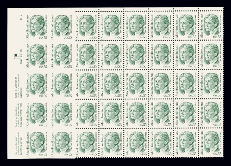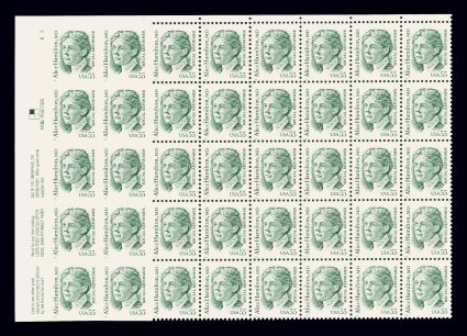 1067 nhPB 2940a image#2940a, 55c Alice Hamilton, imperforate, five such pairs contained in a top left plate number block of forty, the left ten stamps being imperforate, while the other stamp are normal, o.g., n.h., extremely fine; this transition block represents five of the twenty recorded pairs, making this a very rare error multiple; unpriced in Scott and Datz. (imagea) (Image) Est. 3,000-4,000