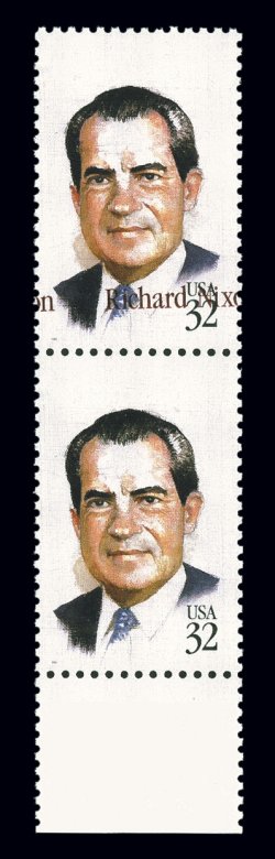 1068 nh 2955a image#2955a, 32 Richard Nixon, red (engraved) omitted, error in a bottom margin vertical pair, the bottom stamp with the red completely omitted, the top stamp with the red color present but strongly shifted, o.g., n.h., very fine; particularly impressive in this transitional format. (Image) $1,250.00+