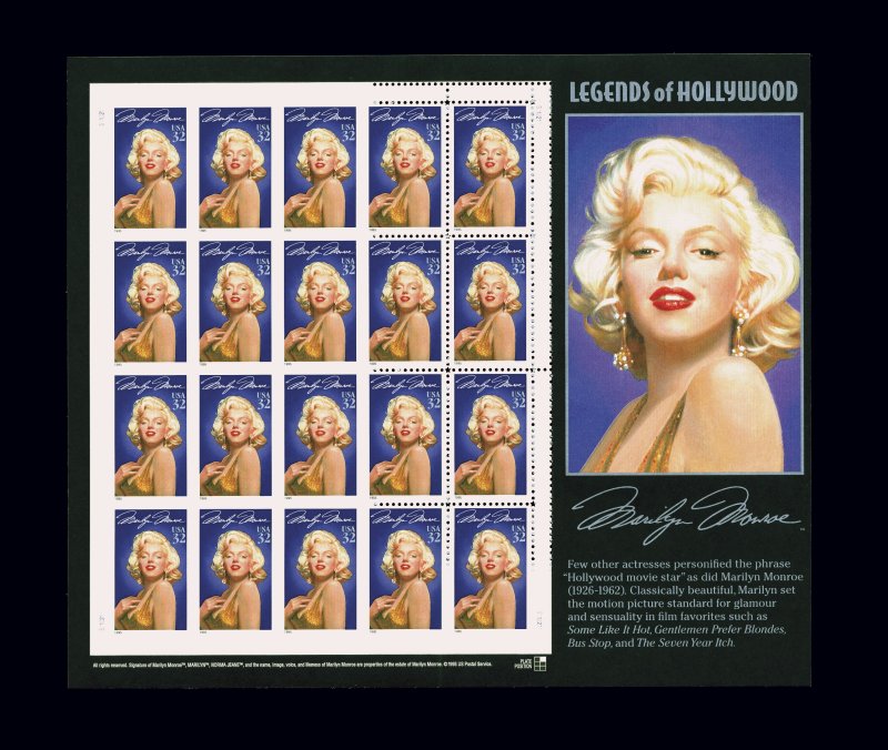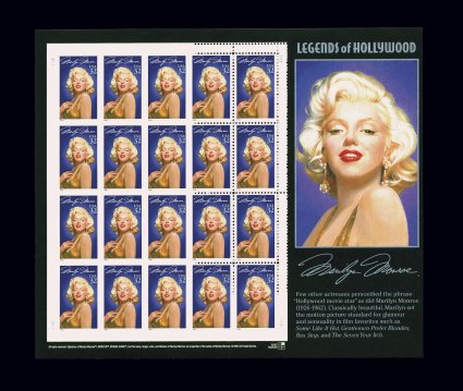 1069 nhbl 2967a image#2967a, 32c Marilyn Monroe, imperforate, pane of 25 with the left three rows completely imperforate, the fourth row partially perforated, and the last row normally perforated, and with extra perforations in the outer margins at top right, o.g., n.h., very fine; according to Datz, only three panes exist in this transitional format; just the six imperforate pairs catalog $3,300.00. (imagea) (Image) Est. 2,000-3,000