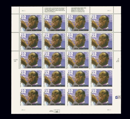 1070 nhbl 2982 var. image#2982 var., 32c Louis Armstrong, imperforate, four imperforate pairs in a transitional pane of twenty, the errors being the bottom two rows, o.g., n.h., very fine; this is a unique pane and represents all of the known imperforate stamps of this issue; not yet listed in Scott or Datz. (imagea) (Image) Est. 5,000-7,500