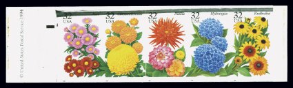 1071 nhBP 2997b image#2997b, 32c Garden Flowers, booklet pane of five, imperforate, error pane still in the original booklet, with usual booklet fold and rejection mark at top, o.g., n.h., very fine; an extremely rare booklet pane error, with perhaps only one other in existence. (Image) Est. 4,000-5,000