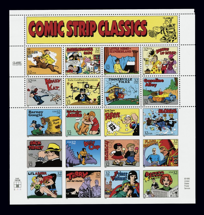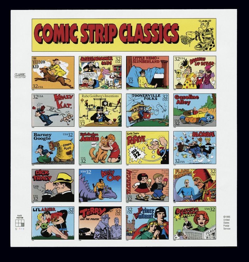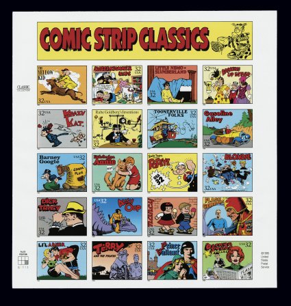 1073 nhbl 3000x image#3000x, 32c Comic Strips, pane of twenty, imperforate, o.g., n.h., a few light fingerprints on gum, very fine; a major modern error rarity, with Datz stating only one or two completely imperforate panes exist; listed but unpriced in Scott or Datz. (imagea) (Image) Est. 4,000-5,000