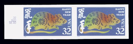 1074 nh 3060a image#3060a, 32c Year of the Rat, imperforate, left margin horizontal pair, large margins all around, o.g., n.h., extremely fine and scarce. (Image) $800.00