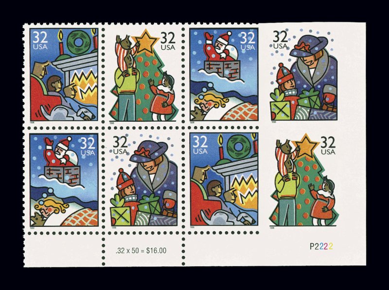 1075 nhPB 3111b image#3111b, 32c Christmas, se-tenant strip of four, imperforate between third and fourth stamps, the unique bottom right plate no. 2222 block of eight containing two error strips, o.g., n.h., fingerprints on gum, very fine; a great rarity, as only three examples are known (this plate block, one block, and one strip); listed but unpriced in Scott and Datz. (imagea) (Image) Est. 3,000-4,000