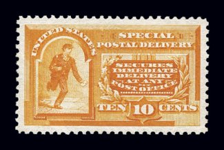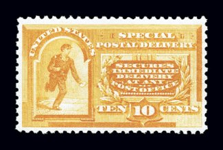 1121 og E3 image#E3, 10c Orange, an eye-arresting jumbo-margined mint example, boasting enormously large margins and being perfectly centered within them, gorgeous intense and vibrant color, o.g. with just a couple of natural gum bends, relatively lightly hinged, extremely fine; clear 2002 PF certificate. (Image) $250.00