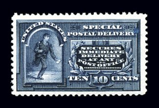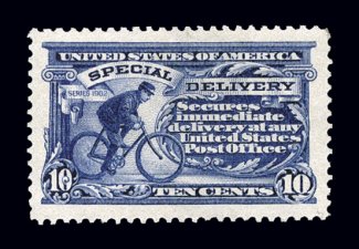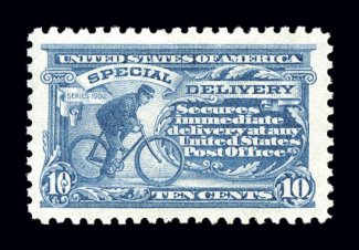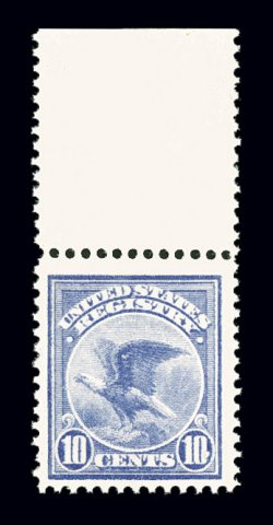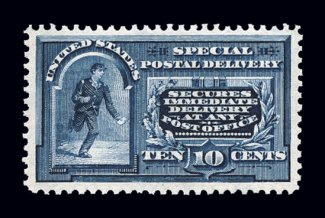 1126 nh E9 image#E9, 10c Ultramarine, handsome top sheet-margin single, extraordinarily large margins all around, lovely pastel color and a clean detailed impression on bright paper, o.g., n.h., extremely fine; 2003 PF certificate. (Image) $400.00