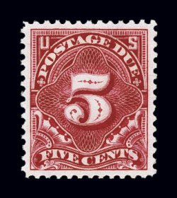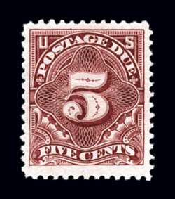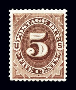 1136 og J34 image#J34, 5c Deep claret, exceptionally well centered mint single, surrounded by extravagantly large margins, rich luxuriant color and a deeply etched impression, o.g., lightly hinged, extremely fine; 2004 PF certificate. (Image) $325.00