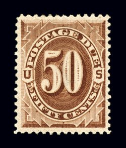 1133 og J21 image#J21, 50c Red brown, a remarkably fresh and bright mint example of this rare postage due, featuring beautifully rich color and a crisp impression on clean paper, exceptional centering as well within large margins, full clean o.g. that has been only lightly hinged, extremely fine; an especially difficult stamp to find in such choice condition; 1990 PF certificate. (Image) $1,750.00