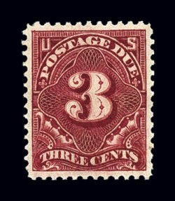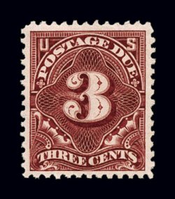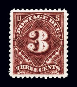1135 og J33 image#J33, 3c Deep claret, an incredibly well centered mint single of an issue that is rarely found well centered with large equal margins all around, exceptionally intense deep color and razor-sharp impression, full clean o.g., very lightly hinged, extremely fine; 1998 PF certificate. (Image) $200.00