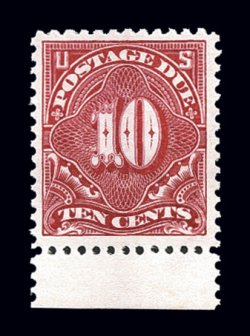 1138 nh J42 var. image#J42 var., 10c Carmine, handsome bottom sheet-margin example of this elusive shade, brilliantly fresh, with rich vibrant color and a razor-sharp impression on clean white paper, uncommonly well centered within lavishly large margins, pristine o.g., n.h., extremely fine; 2003 PF certificate. (Image) $160.00