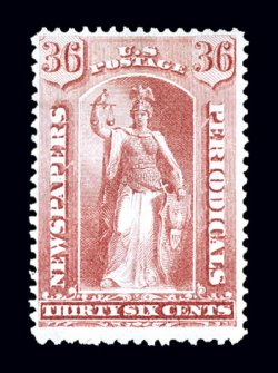 1187 og PR77 image#PR77, $36.00 Indian red, a premium mint example of this scarce newspaper stamp, being quite well centered within large margins, rich vibrant color, full o.g., lightly hinged, very fine and choice; 1999 PF certificate. (Image) $850.00