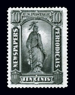 1192 og PR94 image#PR94, 10c Intense black, a premium quality mint example of an impossibly difficult stamp to find in sound original gum condition, with this particular copy featuring huge jumbo margins all around and remarkably well centered within them, plus its color is incredibly intense on bright fresh paper, full clean o.g., lightly hinged, extremely fine; a true condition rarity; 1998 PF certificate. (Image) $900.00