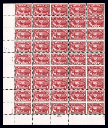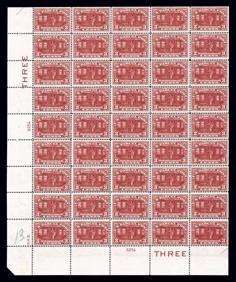 1199 nhbl Q3 image#Q3, 3c Parcel Post, bottom left pane of 50, attractive color, o.g., n.h., small spot on gum on position 17 and small natural inclusion on position 9, fine-very fine; cataloged simply as 50 singles since plate blocks are not priced never hinged. (imagea) (Image) $1,875.00+