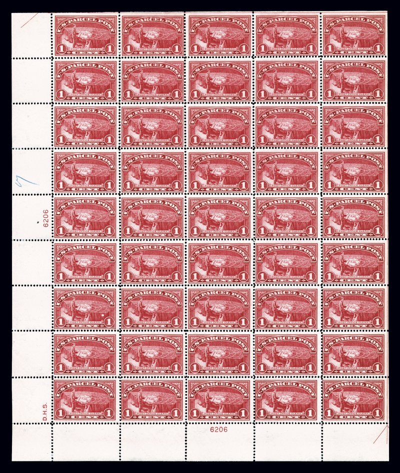 1195 nhbl Q1 image#Q1, 1c Parcel Post, full bottom left plate no. 6206 pane of 50, vibrant color, o.g., n.h., position 2 with natural paper wrinkle, perf. separation on one row in bottom selvage affecting the plate block, centering varies but mainly fine-very fine. (imagea) (Image) $892.00+