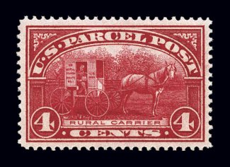 1200 nh Q4 image#Q4, 4c Parcel Post, brilliantly fresh and crisp, lovely rich color, extraordinarily well centered within large margins, plus crisp even perforations, o.g., n.h., extremely fine. (Image) $110.00