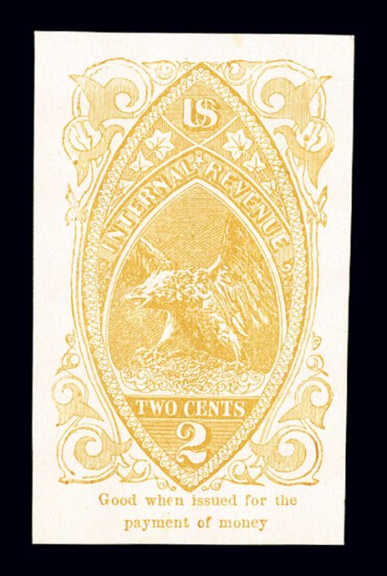 1299 P Proof Ty. B-23 imageProof Type B-23, 2c Orange, die proof on stiff wove cream paper, the type with "Good when issued for the payment of money" in two lines at base, 34x56mm, fresh and very fine; this is a type of the issued stamp but unlisted in Turner as a proof. (Image) Est. 150-200