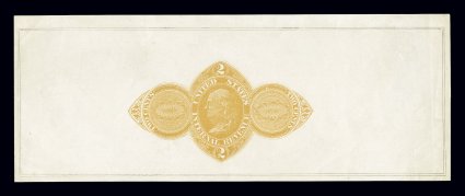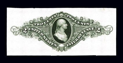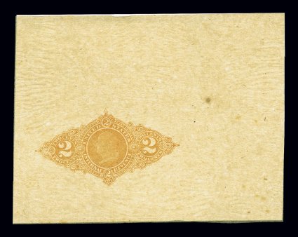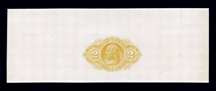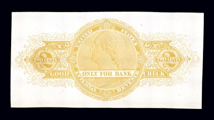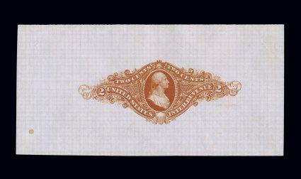 1305 P Proof Ty. F imageProof Type F, 2c Orange, die proof on wove cream paper, similar proof to the above with light black frames printed around the border as might be found on a check, but without the security prints, 187x72mm, light paper wrinkles near the edges, very fine and quite scarce; not listed in Turner nor was any proof of type F present in the Joyce Sale. (Image) Est. 200-300