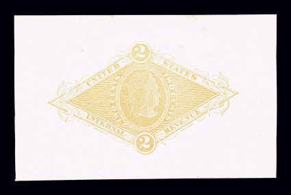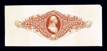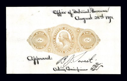 1317 P Turner Proof Ty. K imageTurner Proof Type K, 2c Orange, surface printed die proof on wove paper, 131x78mm, with manuscript "Officer of Internal Revenue/August 23rd 1873" at top and "Approved, B.J. Sweet/Acting Commissioner" at bottom, two pinholes at top left from attachment to Butler & Carpenter order book and a bit of adhesive remnant on reverse, very fine; unique; ex-Deats and illustrated in Turner on page 104. (Image) Est. 1,500-2,000