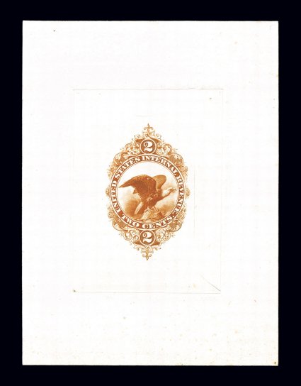 1307 E Turner Model Ty. H imageTurner Model Type H, 2c Black, pencil and wash drawing, plus engraved lathework and sepia photograph of eagle pasted on card, 76x110mm, with several manuscript notations including "Approved E.A. Rollins, Commissioner Int. Rev" at right and "Office of Int. Rev./February 12/67", very fine; the unique model essay for this design; ex-Deats and illustrated in Turner on page 102. (Image) Est. 2,000-3,000