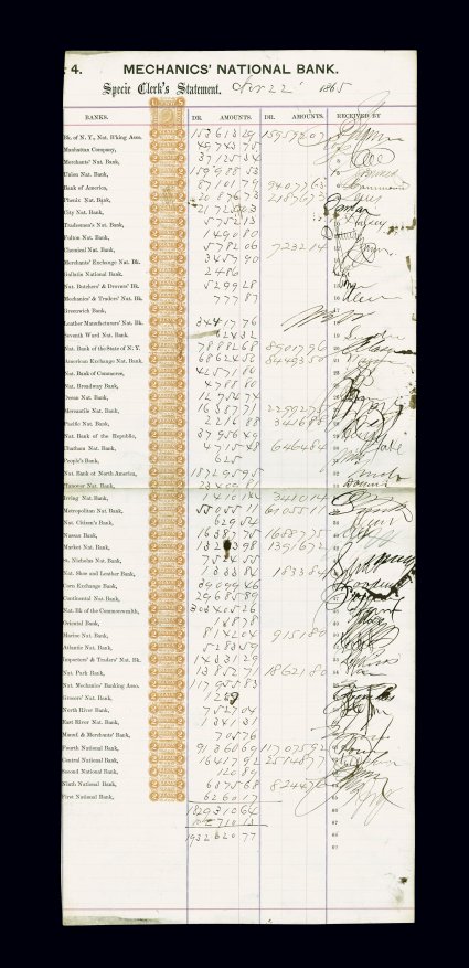 1353 c RN-A11 image#RN-A11, 2c Orange, "Tapeworm" of one full and 53 partial impressions, New York, New York, on 1865 "Mechanics' National Bank" specie clerk's statement, 53 banks listed at left corresponding to 2c tax for each, full document, extra clean and fresh with the one horizontal fold as found on all of these, very fine and an especially nice example of this scarcer early form before the additional three banks were added. (Image) $1,250.00