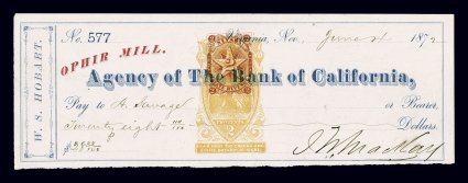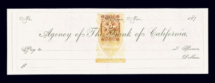 1356 c RN-16a image#RN-B16a, 2c Orange with restrictive clause in rectangular tablet at base, with 2c Orange red Nevada, Virginia, Nevada, used 1872 check of "Agency of The Bank of California", imprinted for W.S. Hobart, normal cut cancel, very fine and attractive. (Image) $225.00