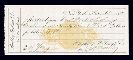 1357 c RN-C16 image#RN-C16, 2c Orange with restrictive clause at lower left, New York, New York, 1870 receipt of "Buckley and Wellington & Co.", printed by Nathan Lane of New York, unobtrusive horizontal fold as well as the usual vertical folds, otherwise very fine and a scarce format which is usually only found used. (Image) $350.00