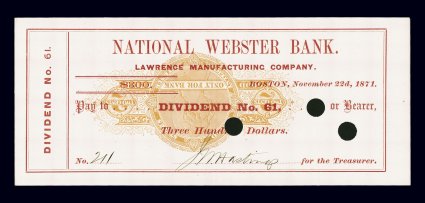 1359 c RN-C21a image#RN-C21a, 2c Orange with restrictive clause in three-part band, stamp inverted, Boston, Massachusetts, 1871 dividend check of the "National Webster Bank" for the Lawrence Manufacturing Co., crisp used check, very light usual vertical folds and punch holes after being cashed, very fine; error resulted in feeding the pre-printed stamped paper upside down when the checks were printed, one of the few known with this variety. (Image) $550.00