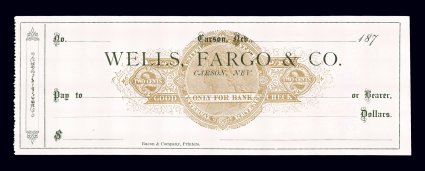 1360 ogc RN-C22 image#RN-C22, 2c Brown with restrictive clause in three-part band, Carson, Nevada, crisp and unused check of "Wells, Fargo &Co.", printed by Bacon & Company, extremely fine; scarce unused and particularly so in this premium condition. (Image) $300.00