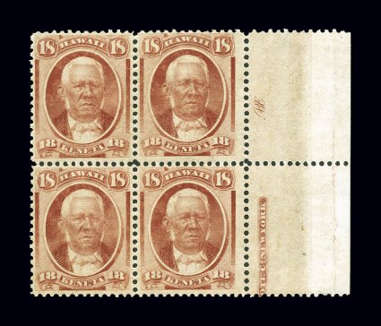 1404 nhbl 34 image#34, 18c Dull rose, impressive right sheet-margin part imprint block of four with "ABC" monogram, possessing unusually deep color and freshness, well centered, full o.g., the stamps have the usual light offset on gum though they have never been hinged except in the lower right selvage only, very fine; ex-Pietsch. (Image) $390.00+