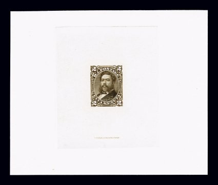 1405 P 35P1 image#35P1, 1875 2c Brown, large die proof on India, India measuring 63x73mm die sunk on card 121x101mm, "National Bank Note Co. N.Y." imprint below, wonderfully fresh and crisp, extremely fine. (Image) $650.00