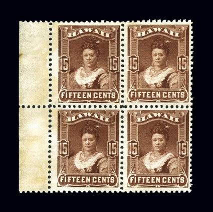 1406 og/nhbl 41 image#41, 15c Red brown, a premium quality left sheet-margin block of four which possesses rich color and exceptional freshness, o.g., lightly hinged on the top two stamps, never hinged singles at bottom, very fine; choice mint multiple; ex-Weill, Wilcox and Pietsch. (Image) for hinged $260.00
