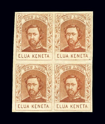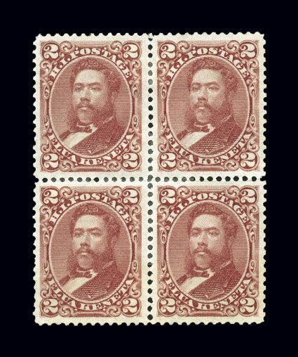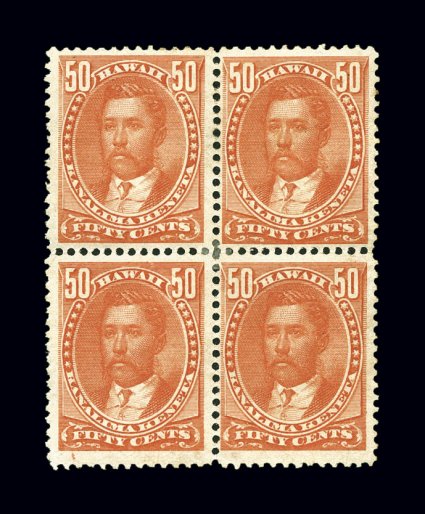 1413 Obl 50 image#50, 2c Orange vermilion reproduction, a well centered block of four of the 1886 American Bank Note Co. issue, reproducing the King Kamehameha IV issue of 1869, the block has favor cancels like virtually all known used singles, very fine; Scott prices a mint block of four at $800.00 but does not price used examples; ex-Pietsch. (Image) Est. 200-300