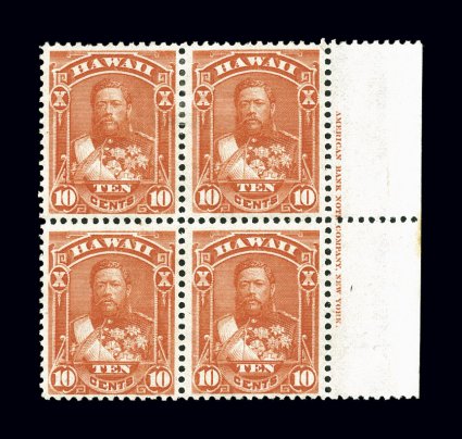 1408 ogbl 45 image#45, 10c Vermilion, a particularly well-centered right sheet-margin imprint block of four of the American Bank Note Co. issue of 1883; brilliant color, full o.g. with light offset, very fine; scarce position piece; ex-Pietsch. (Image) $175.00