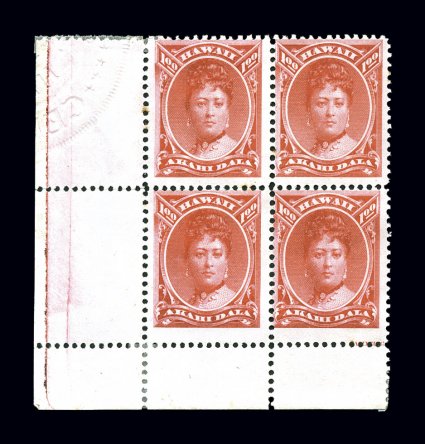 1411 og/nhbl 49 image#49, $1.00 Rose red, impressive bottom left corner margin block of four of this key high value, portion of embossed official certification seal in the left selvage, especially fresh with radiant color, full o.g., right pair never hinged, attractive fine centering; a nice position piece of this exceptionally scarce block of four. (Image) for hinged $1,250.00