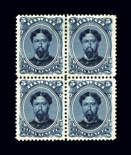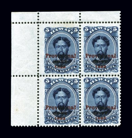 1420 ogbl 58, 58b image#58, 58b, 5c Deep Indigo with red Provisional Govt. overprint, no period after "Govt", position 6 (M-H 74.651), in top left corner margin block of four, positions 1-2/6-7, plus position 1 shows the broken "G" of "Govt." variety (M-H 74.661), incredibly deep color on white paper, o.g., fine-very fine; ex-Honolulu Advertiser. (Image) $255.00