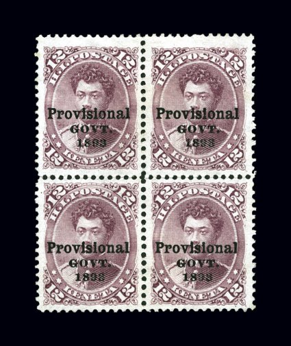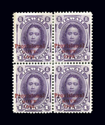 1418 ogbl 53, 53b image#53, 53b, 1c Purple with red Provisional Govt. overprint, no period after "Govt", position 6 (M-H 66.651), bottom left stamp in a wonderfully well centered mint block of four, positions 1-2/6-7, with position 1 also showing the broken "G" of "Govt." variety (M-H 66.661), bright fresh color, o.g., minor h.r. in top pair, choice very fine; an unusually select block with this popular variety; ex-Pietsch. (Image) $232.50