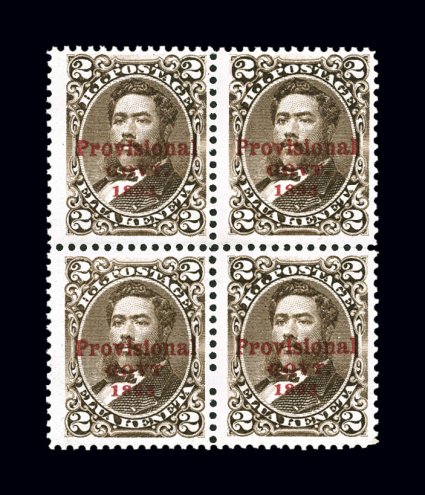 1419 ogbl 56, 56b image#56, 56b, 2c Brown with red Provisional Govt. overprint, no period after "Govt", position 6 (M-H 69.651), in mint block of four, positions 1-2/6-7, plus position 1 shows the broken "G" of "Govt." variety (M-H 69.661), deep color on bright paper, o.g., fine-very fine; ex-Honolulu Advertiser. (Image) $330.00