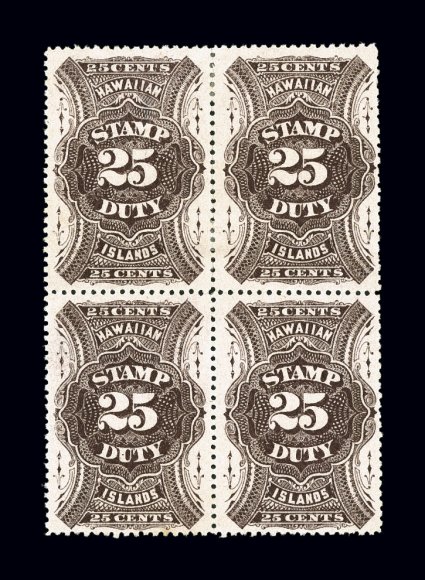 1442 ngbl R10 image#R10, 25c Violet brown revenue, very scarce unused block of four, rich luxuriant color, particularly well centered, top left stamp with small thin spot, otherwise very fine; an exceptionally scarce multiple of this difficult value; Scott catalog value for four singles. (Image) $3,000.00+