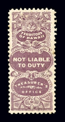 1445 og M-H #463 imageM-H #463, No value, Dark lilac revenue issue, a very unusual mint copy of the "Territory of Hawaii/Not Liable to Duty/Treasurer's Office" issue, fresh color, full original gum, trivial light gum toning flecks as usual, very fine; ex-Pietsch. (Image) Est. 400-500