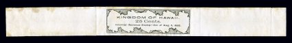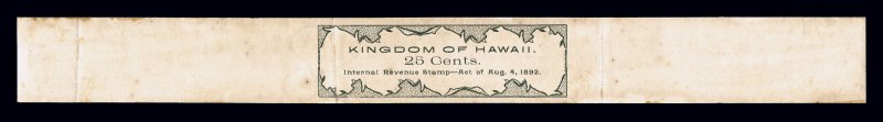 1447 E M-H #571 imageM-H #571, 25c Black on grayish wove paper, Playing Card revenue stamp essay, full size band measuring 300x31mm with 95mm portion at right reattached, usual folds reinforced not affecting the design, paper unusually white with only a few spots of toning because the gum which caused the toning had been removed, very fine appearance; ex-Honolulu Advertiser. (imagea) (Image) Est. 500-750